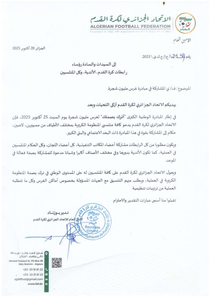 في إطار مساهمتنا الفعلية في الحفاظ على بيئتنا والمشاركة في بناء مستقبل أخضر للأجيال القادمة، تُعلن الرابطة الرياضية لكرة القدم عن انخراطها الكامل في مبادرة غرس مليون شجرة يوم 25 أكتوبر الجاري، وذلك بمشاركة كل أعضاء مكتبها التنفيذي، وطاقمها الإداري، وحكامها.