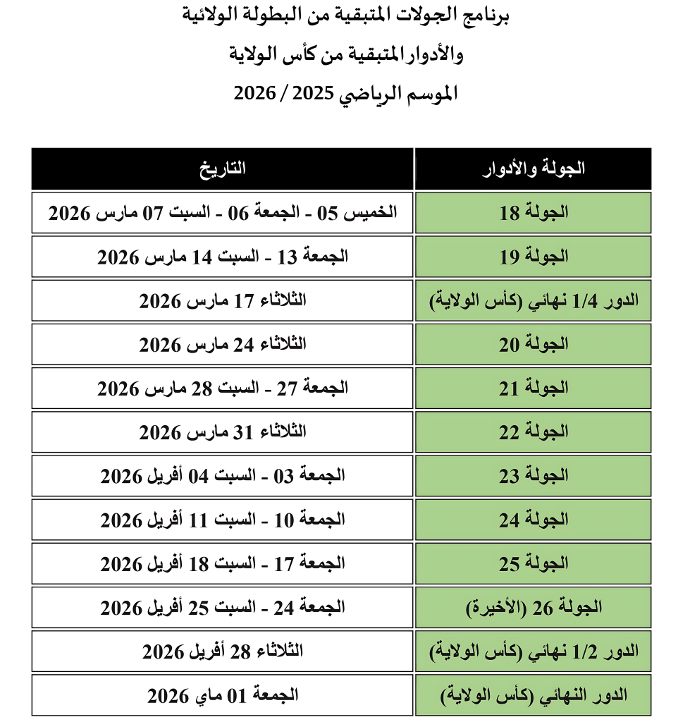 الرئيسية/ACCUEIL/برنامج الجولات والأدوار المتبقية موسم 2025 / 2026 برنامج الجولات والأدوار المتبقية موسم 2025 / 2026