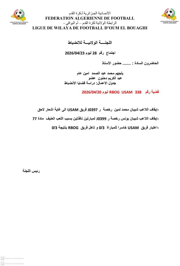 قراراة لجنة الانضباط كأس الولاية مقابلةRBOG vs USAM